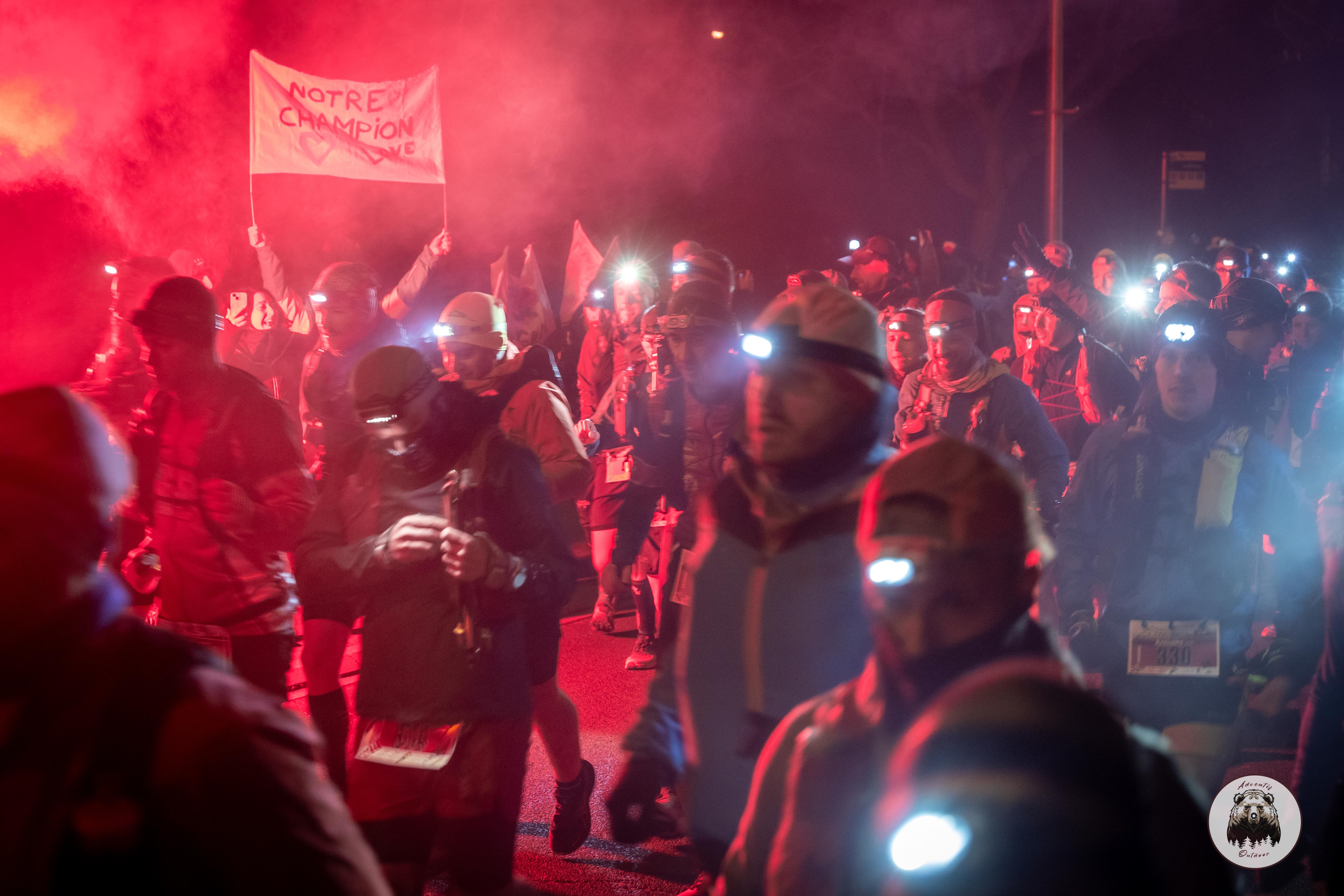 Un départ dans la nuit avec la musique et les fumigènes.